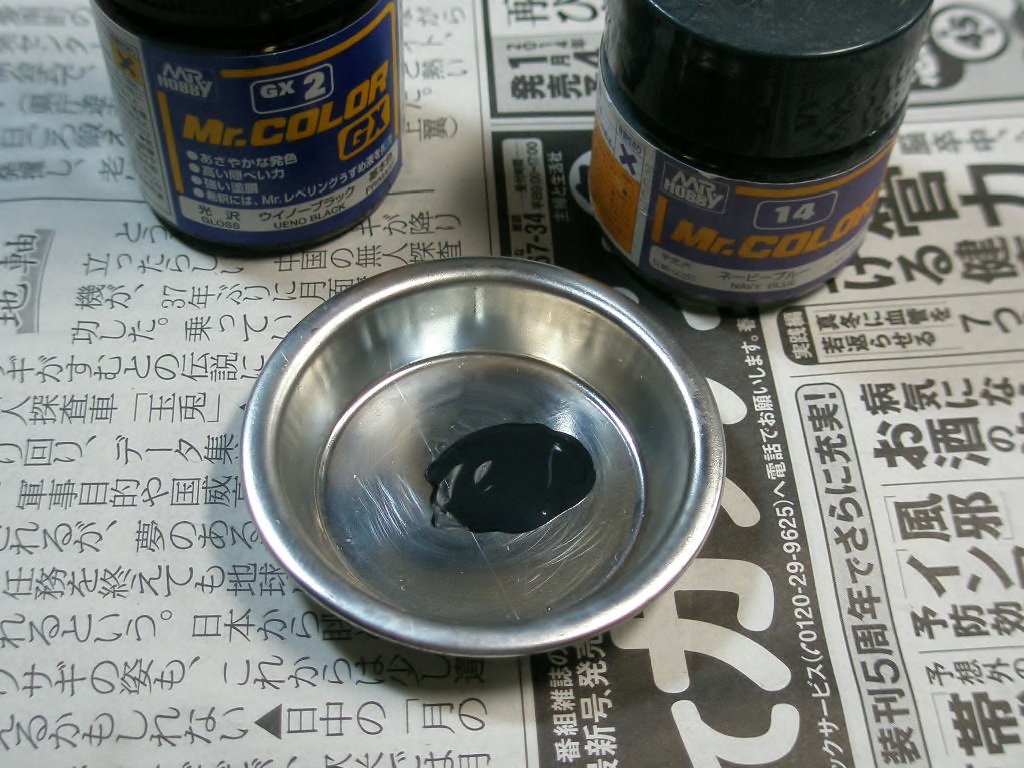 コートのエッジの部分の塗装が剥げていたので調色します。調色は苦手なので期待しないで下さい。ネイビーブルーにブラック系の塗料をチビリチビリ足していきます。