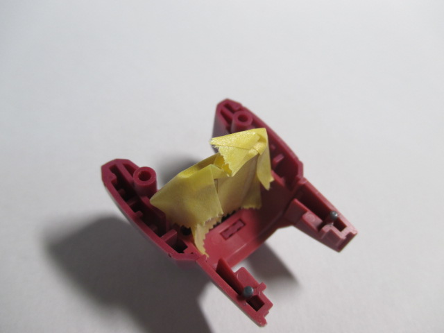 RGズゴックはスライドしてフレームに差し込む部分が多いので、塗装が乗ると後ではがすのが手間なので、直感でマスキングしておきます。